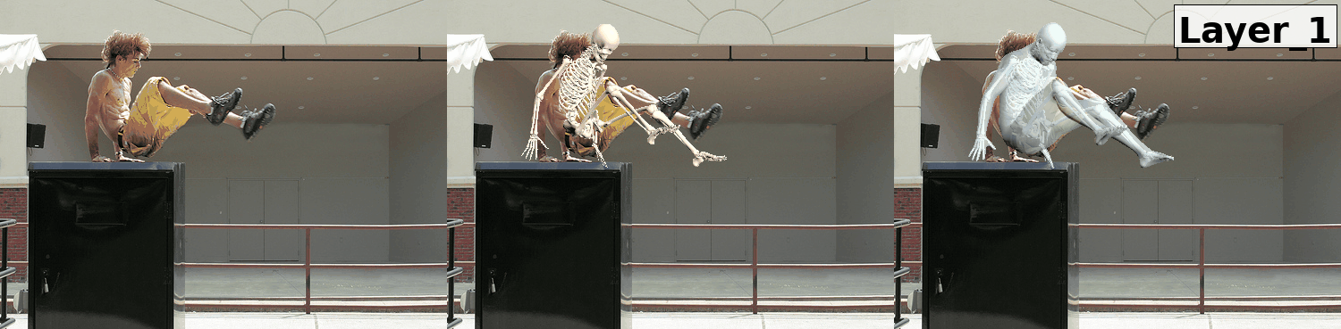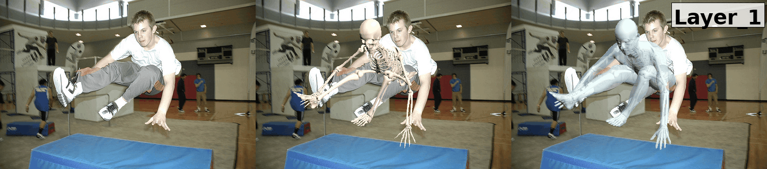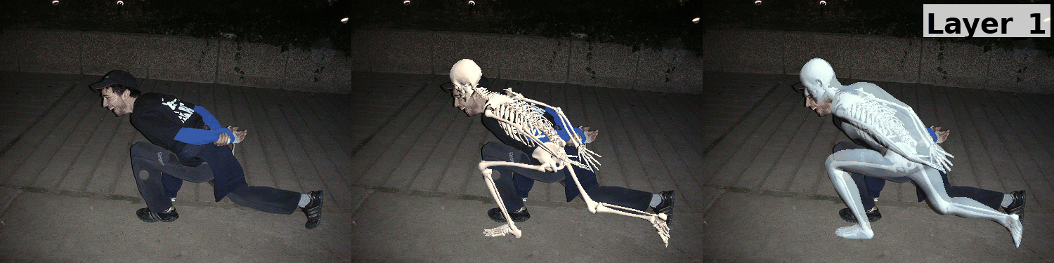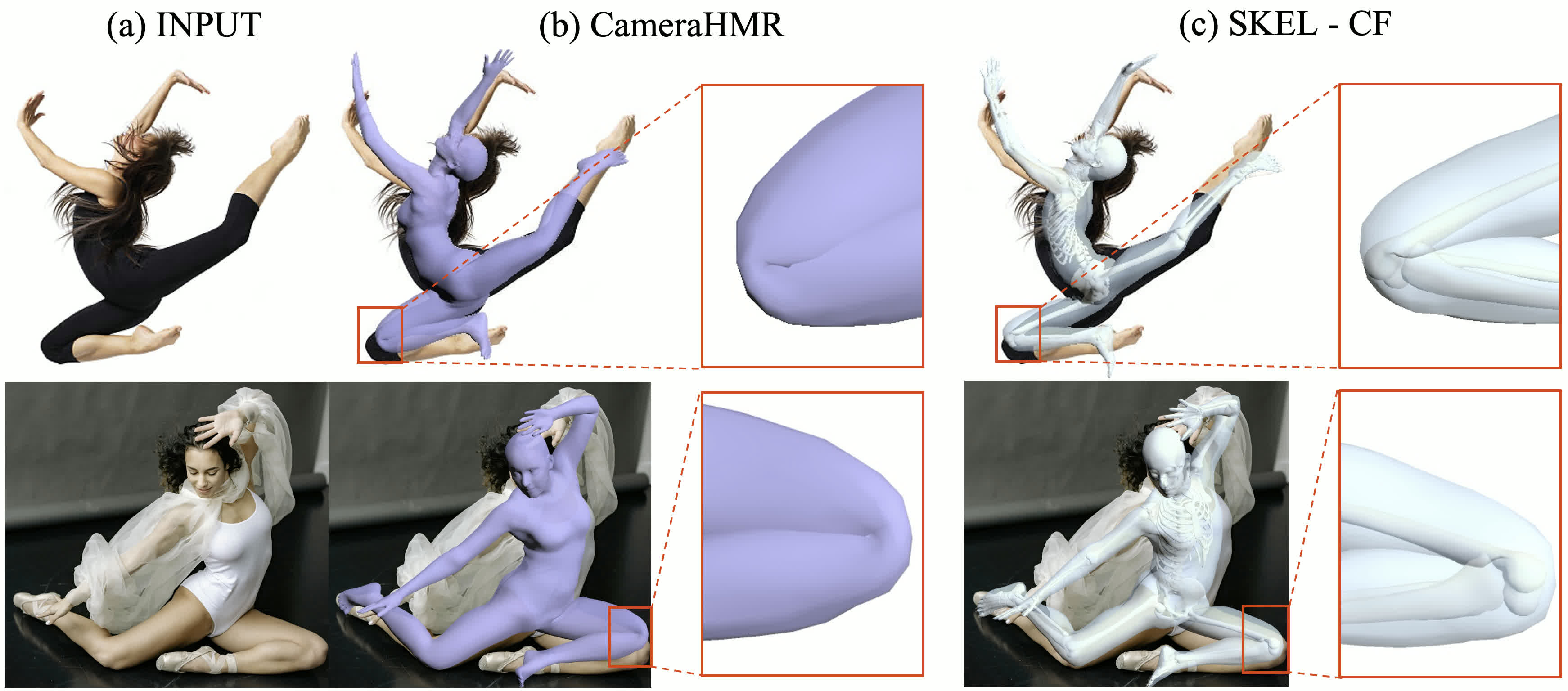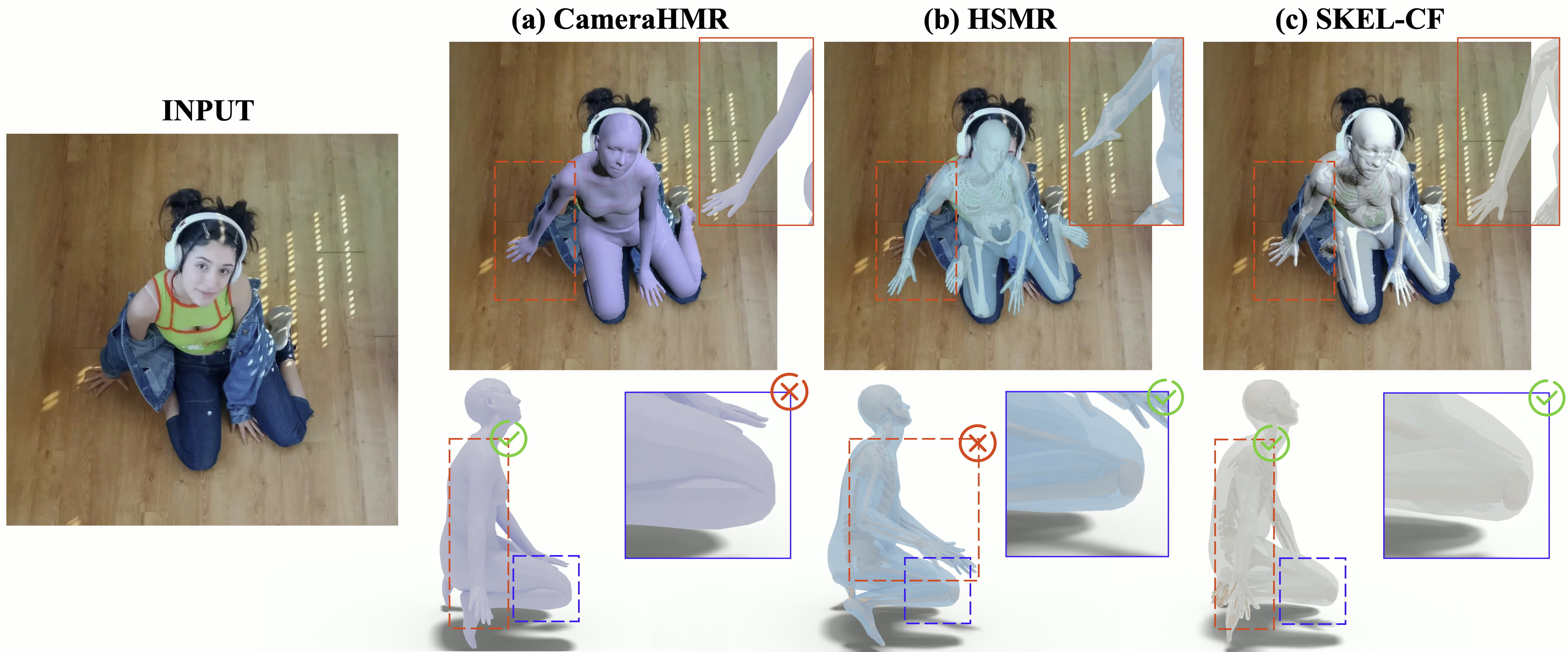 Visual comparison between the proposed SKEL-CF and CameraHMR. The proposed SKEL-CF is built upon the SKEL representation, which enforces anatomically consistent joint motion, resulting in more natural pose predictions compared to the SMPL-based CameraHMR (best viewed in zoom).