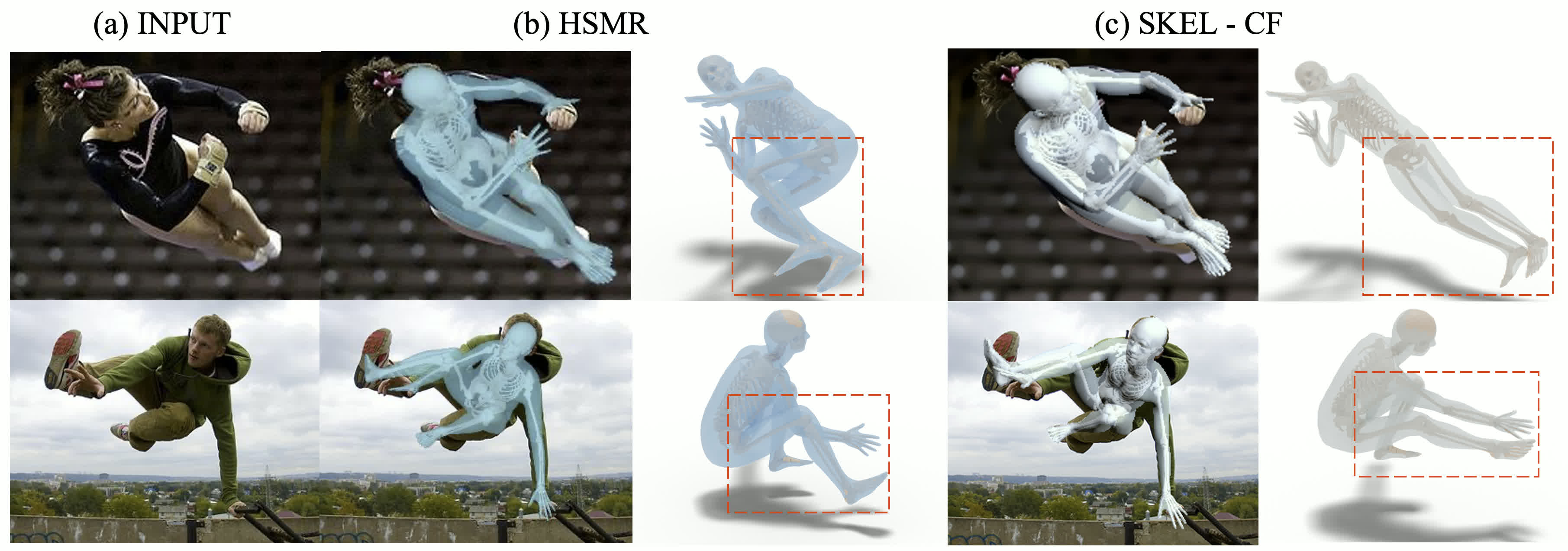 Visual comparison between the proposed SKEL-CF and HSMR. Our proposed SKEL-CF achieves more precise skeletal estimations (best viewed in zoom).