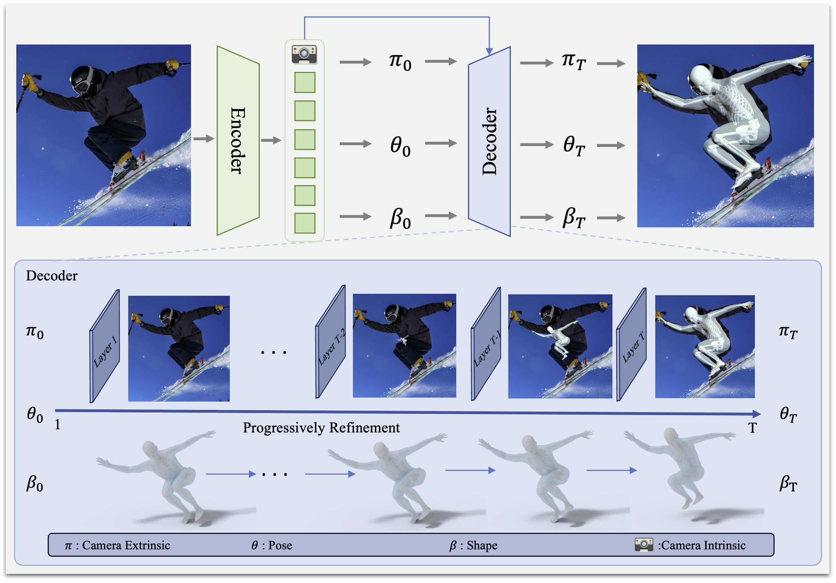 Overview of the proposed SKEL-CF. Our method estimates SKEL parameters from a single image using an encoder–decoder architecture that performs coarse-to-fine estimation. The encoder produces initial predictions of the camera extrinsics π, shape parameters β, and pose parameters θ. The decoder then refines these predictions progressively across layers. In addition, we adopt the camera model from CameraHMR to estimate the camera intrinsics.